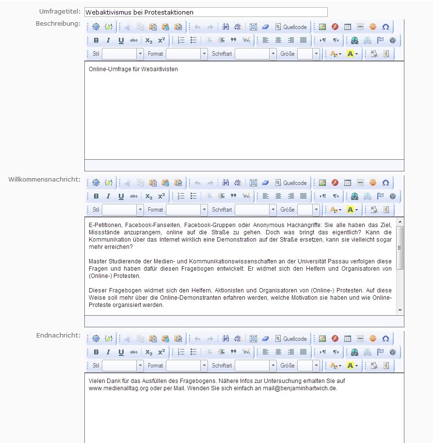 Bei Fragen zu LimeSurvey gerne schreiben. Ich kann auch gegen einen kleinen Obulus gerne Zugang zu meinem System gewähren, dann kannst du für deine Arbeit eine Umfrage erstellen.